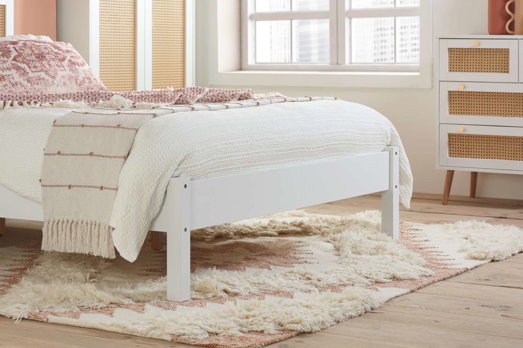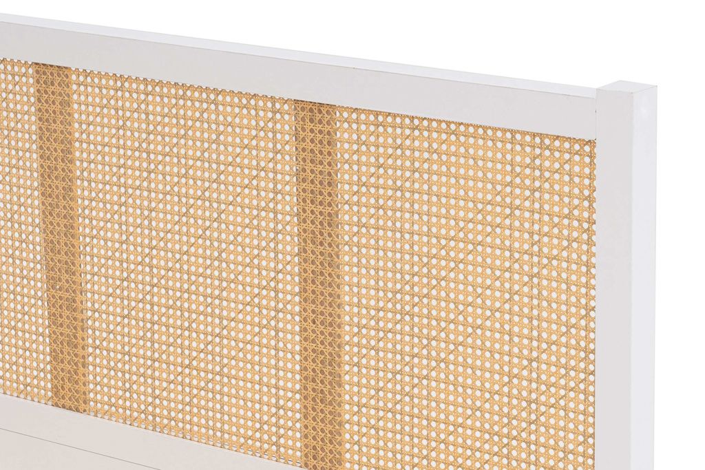 - A white wooden bed with a rattan headboard, measuring 150cm. Its minimalist design blends well with modern and traditional interiors. A durable and timeless piece for a restful sleep.