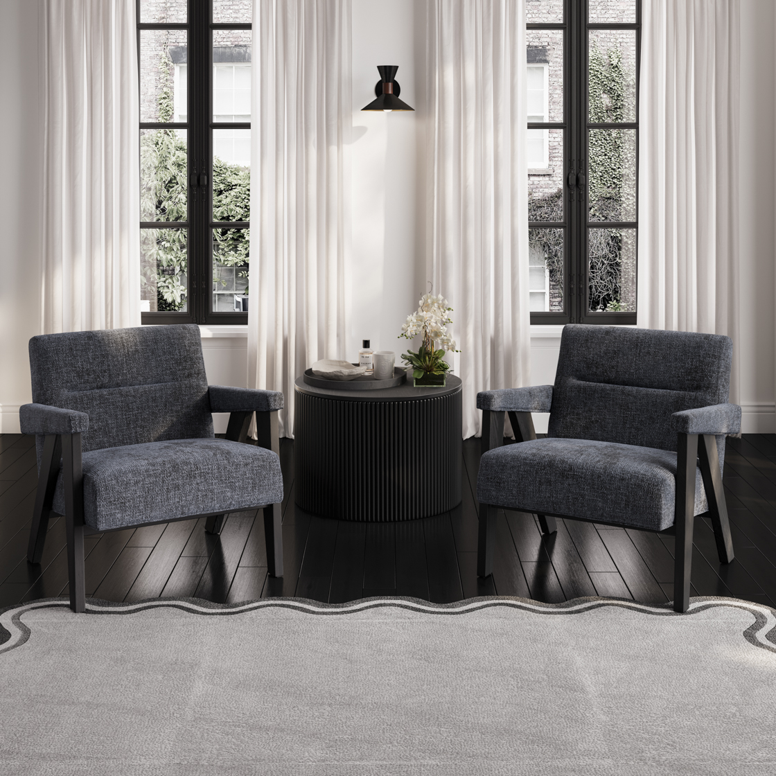 - A modern accent chair featuring soft, deep-seat cushioning and a relaxed back angle for lounge-style comfort. The chair is upholstered in a textured coal fabric and supported by a bold black wooden frame with angled arms, adding a contemporary, architectural look suitable for living spaces, bedrooms, or reception areas.