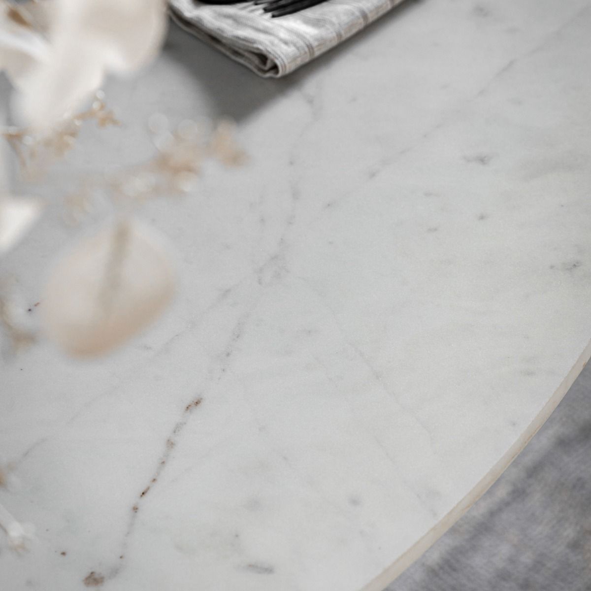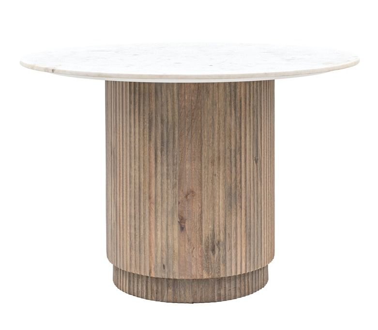 - Offering a modern classic look, this stunning dining table exudes timeless quality and beauty. It is crafted from solid mango wood, with a striking vertical ribbed feature on the drum base, and a polished Indian white Carrera marble top with classic grey/blue veins running through it. Matching pieces available.