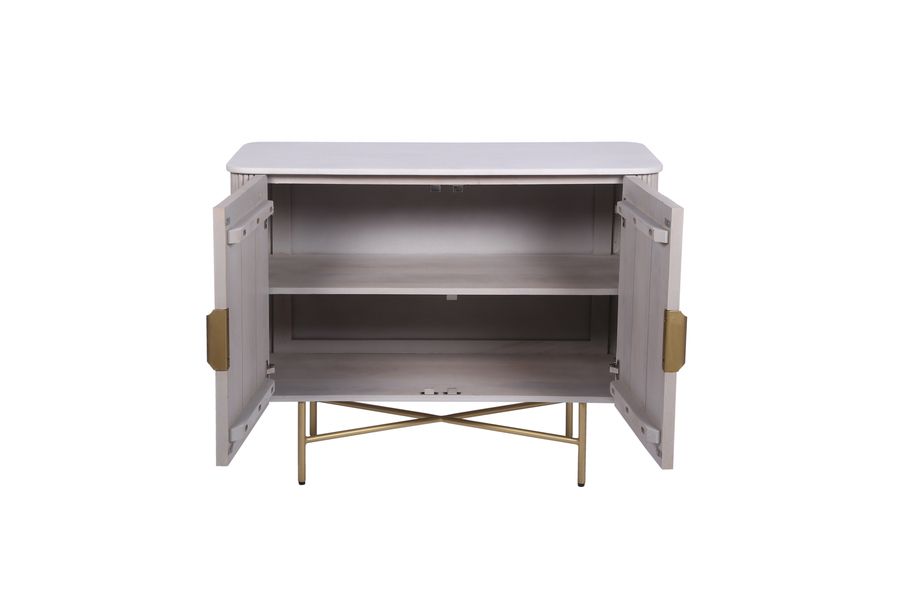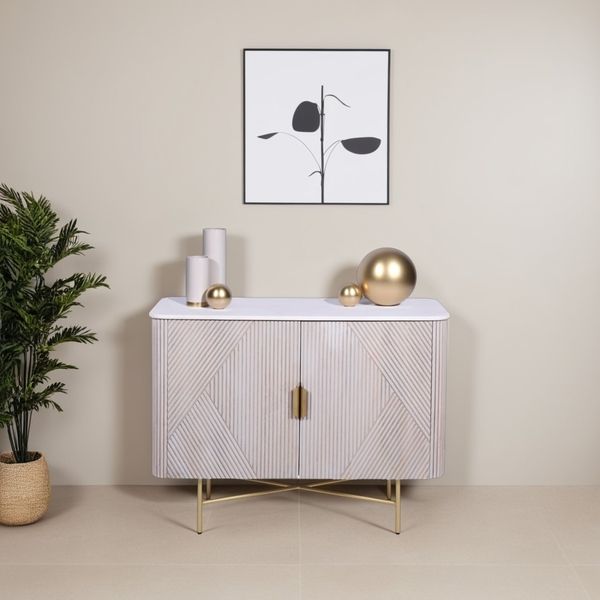 - The Amiri 2 Door Sideboard brings contemporary luxury to any living or dining space with its beautifully carved geometric door fronts and soft, whitewashed finish. Supported by elegant brushed-gold metal legs, it strikes a perfect balance between modern glamour and artisan craftsmanship. Compact yet practical, it offers discreet storage space while functioning as a standout decorative piece.