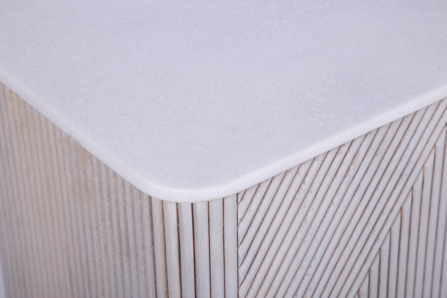- Design: Geometric-patterned 2-door sideboard with curved edges and a sculpted, textured front.