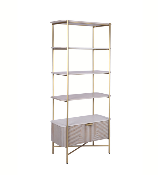 - The Amiri Bookshelf blends modern luxury with practical storage, featuring a soft whitewashed finish paired with elegant brushed-gold framing. Its open, airy structure makes it perfect for displaying decor, books, or plants, while the geometric ribbed drawer adds a stylish touch and hidden storage space. Designed to stand out in living rooms, dining spaces, or home offices, it brings both sophistication and function to any interior.