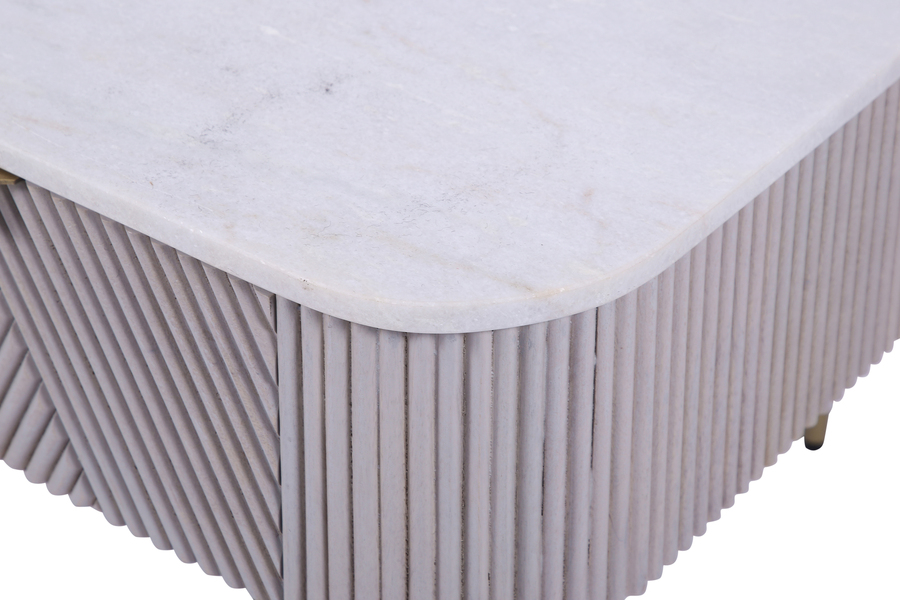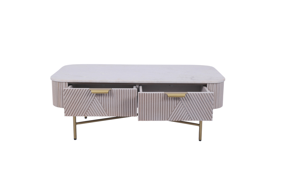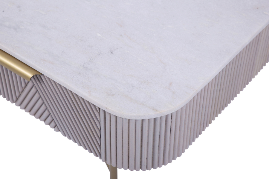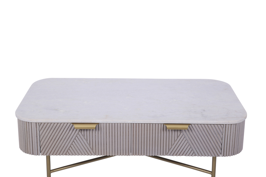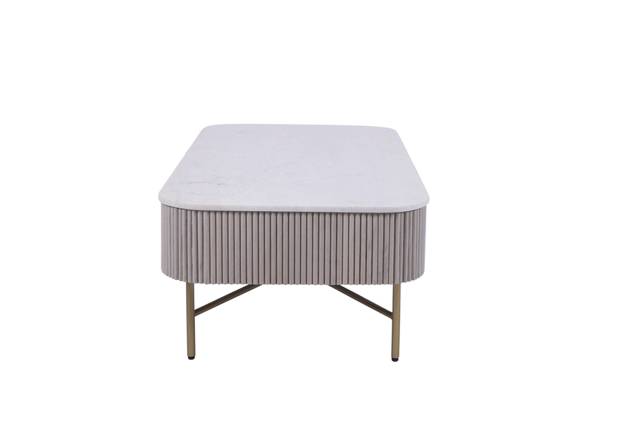 - The Amiri Coffee Table is a statement centrepiece that blends modern luxury with artisanal detailing. Its ribbed geometric front, soft rounded edges, and warm stone-effect top create an elegant focal point for any living room. Supported by a slim gold metal base with an intersecting cross-frame, it adds both sophistication and stability. The soft neutral tones make it easy to pair with a wide range of interior styles, from contemporary to boutique-inspired spaces.