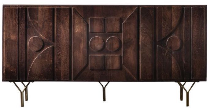 - The Belanosideboard, crafted from solid mango wood, stained with a warm finish to enhance the grain of the wood is the perfect statement piece to add to your home décor. The stylish metal legs; gorgeous geometric door feature pattern; cut -out handles and adjustable shelves create a flawless finish for this beautiful sideboard.