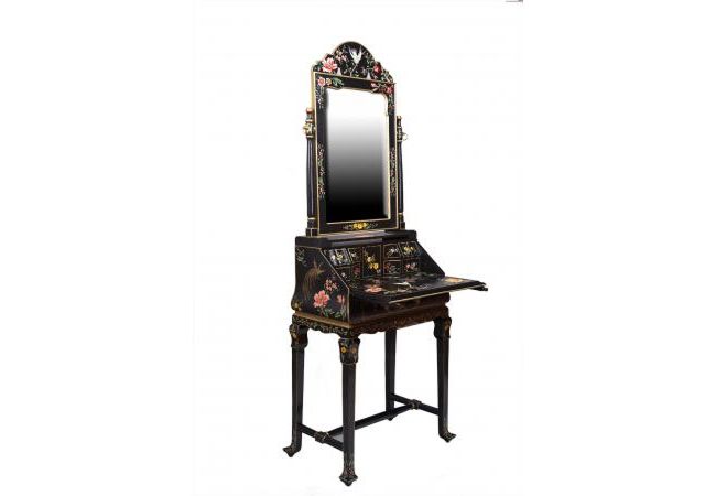 - A hand-painted wooden dresser adorned with a striking black lyre bird design, paired with a matching mirror. This elegant piece combines functionality with artistic craftsmanship. Ideal for those who appreciate detailed furniture with a vintage charm.