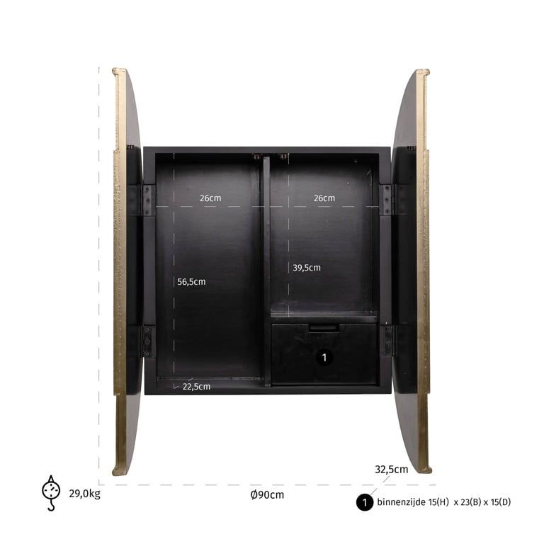 The Bowie Wall Cabinet is crafted from MDF and finished in black and gold for a dramatic look. Its two-door design offers sleek storage for modern homes. Stylish and compact, ideal for wall-mounted convenience.