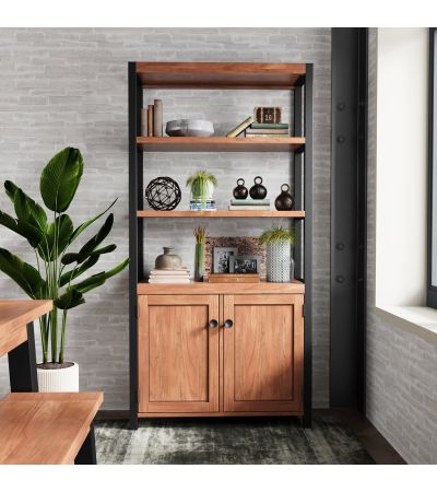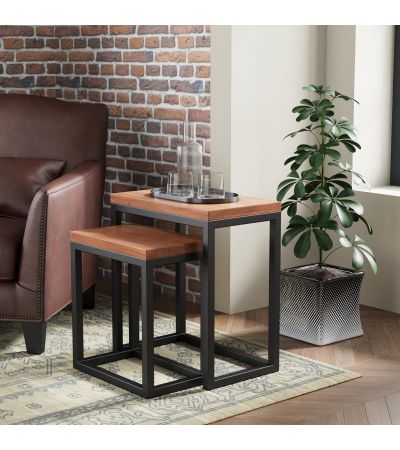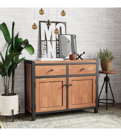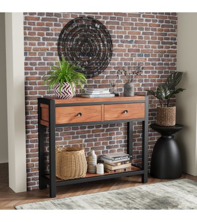Imbued with the rich, dark warmth andrustic appeal of acacia wood, combined with sturdy black metal frames that lendeach piece a loft-living-style industrial feel,this eye-catching range of superbly crafted furniture will enhance any modern home.Featuring reassuringly chunky tops, brush-effect surface finishes - brought out to grain-enhancing perfection with a matt lacquer -and a choice of round or square handles to add your own final touch, the collection also features a number of quirky pieces.