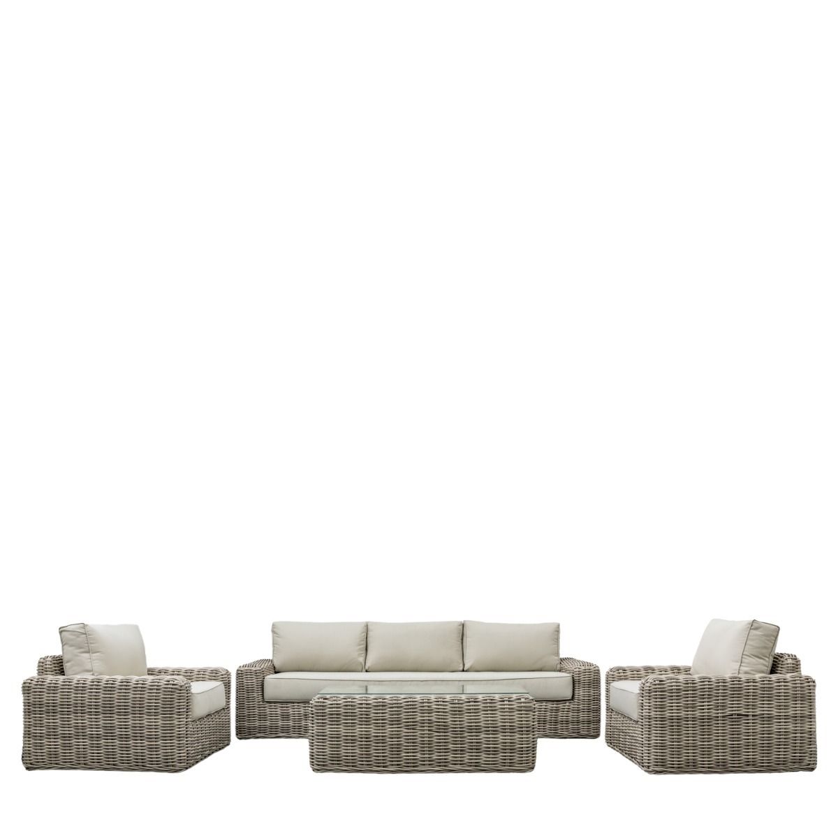 - The stunning Cantania Lounge Set, with a rounded weave rattan pattern, stylish and chunky furniture pieces including a 3-seater sofa, two armchairs and a coffee table, all having aluminium frame for durability and practicality.Also available in a corner lounge set, this garden furniture will bring style and comfort to your garden interior.