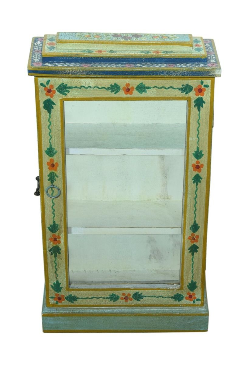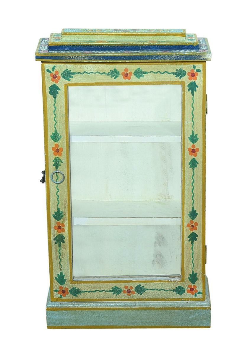 - This intricately hand-painted Florence Meadows side unit is perfect for displaying your crockery, most cherished literary treasures, and keepsakes in style. Crafted by skilled artisans, this beautiful side unit features hand-painted intricate motifs on both sides, on top, and on the front. It has a tiered top and a single-paned glass door with two shelves. It is ideal for living room, study, or bedroom.