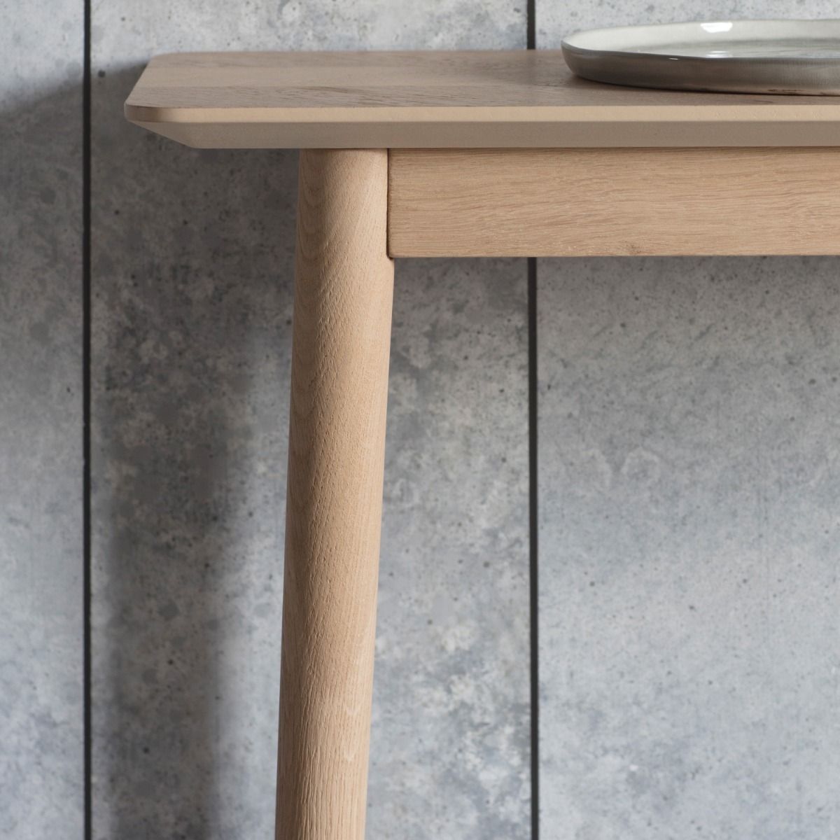 - The stunning Fresco Console Table features a beautiful inlay chevron design, and is made using European oak and rustic oak structured veneers which show the natural beauty of the oak grain and knots. Finished in a specialist mat lacquer, which keeps the timber looking natural and dry, with brushed out grain, the table is tactile to touch and looks amazing. The console table looks great with the Fresco mirror above it.