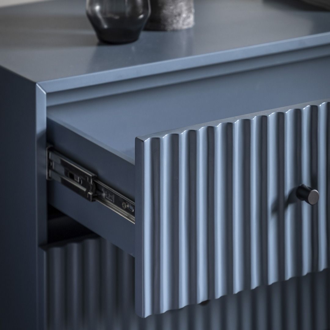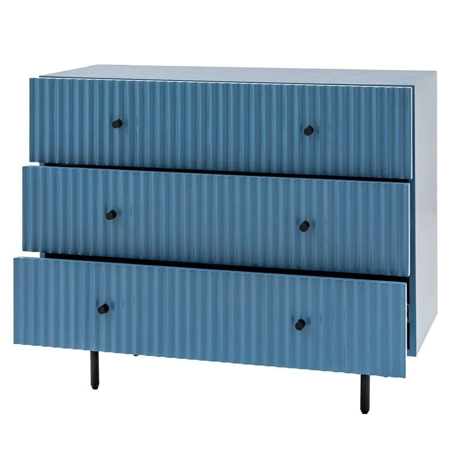 - The drawer fronts of this lovely chest of drawers, in a blue painted finish, feature a stylish vertical scalloped design, giving a unique upmarket look. Black metal legs and handles complete the look. Perfect for any contemporary apartment interior, the wardrobe would equally at home in a wide range of interiors. Matching pieces available. Also offered in white and grey.