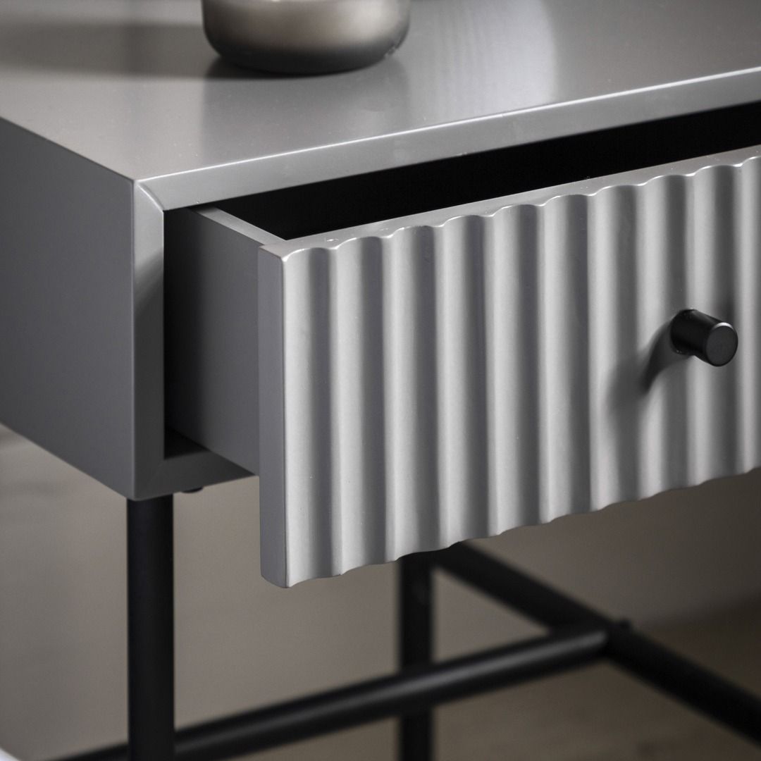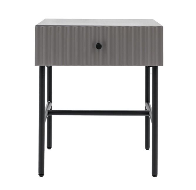 - This lovely bedside, in a painted grey finish, features a lovely drawer fascia which has a stylish vertical scalloped design, giving a unique upmarket look. Black metal legs, underframe and handle complete the look, whilst the drawer gives added practicality. Perfect for any contemporary apartment interior, the bedside would equally at home in a wide range of interiors. Matching pieces available. Also offered in white and blue.