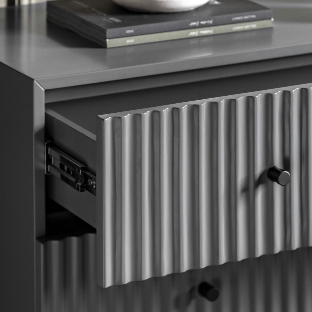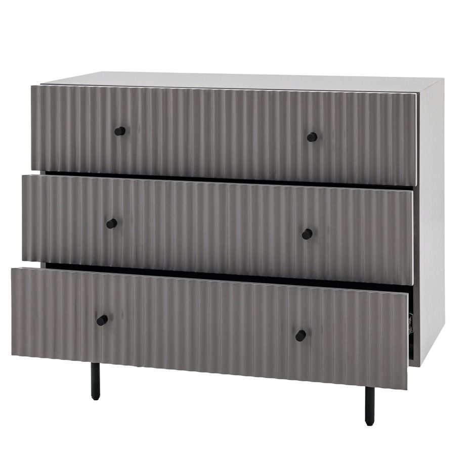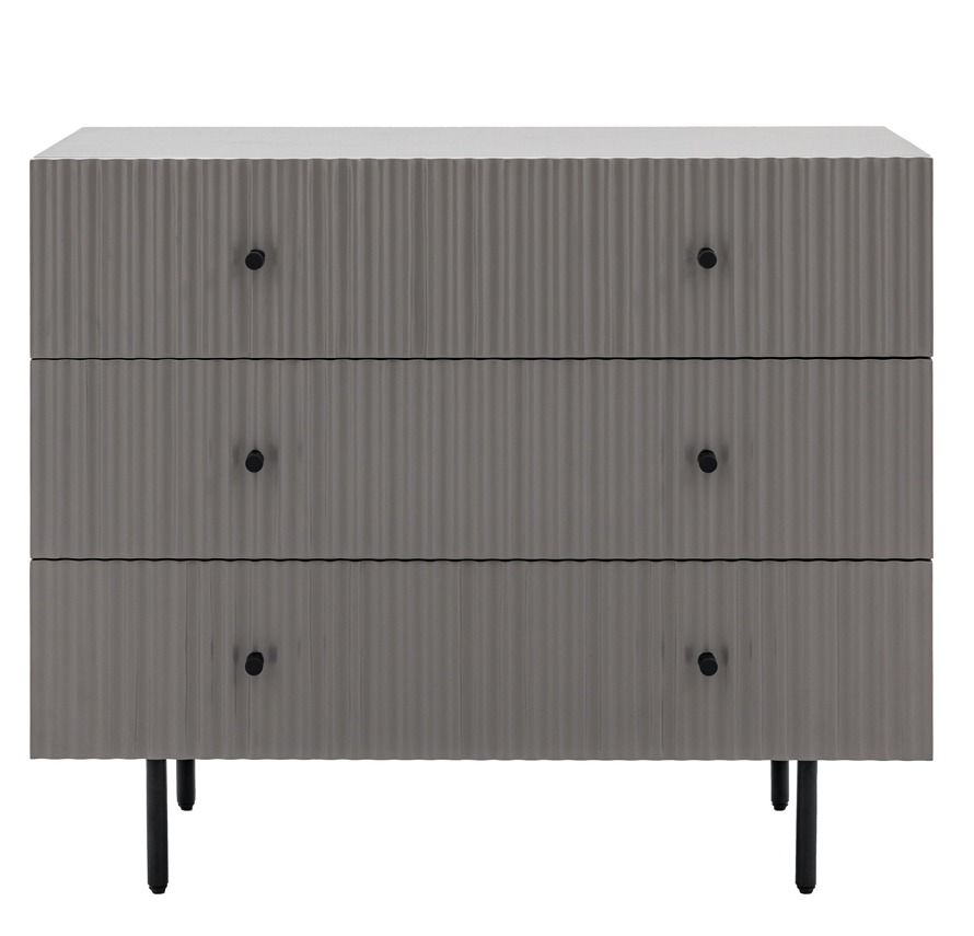 - The drawer fronts of this lovely chest of drawers, in a grey painted finish, feature a stylish vertical scalloped design, giving a unique upmarket look. Black metal legs and handles complete the look. Perfect for any contemporary apartment interior, the wardrobe would equally at home in a wide range of interiors. Matching pieces available. Also offered in white and blue.