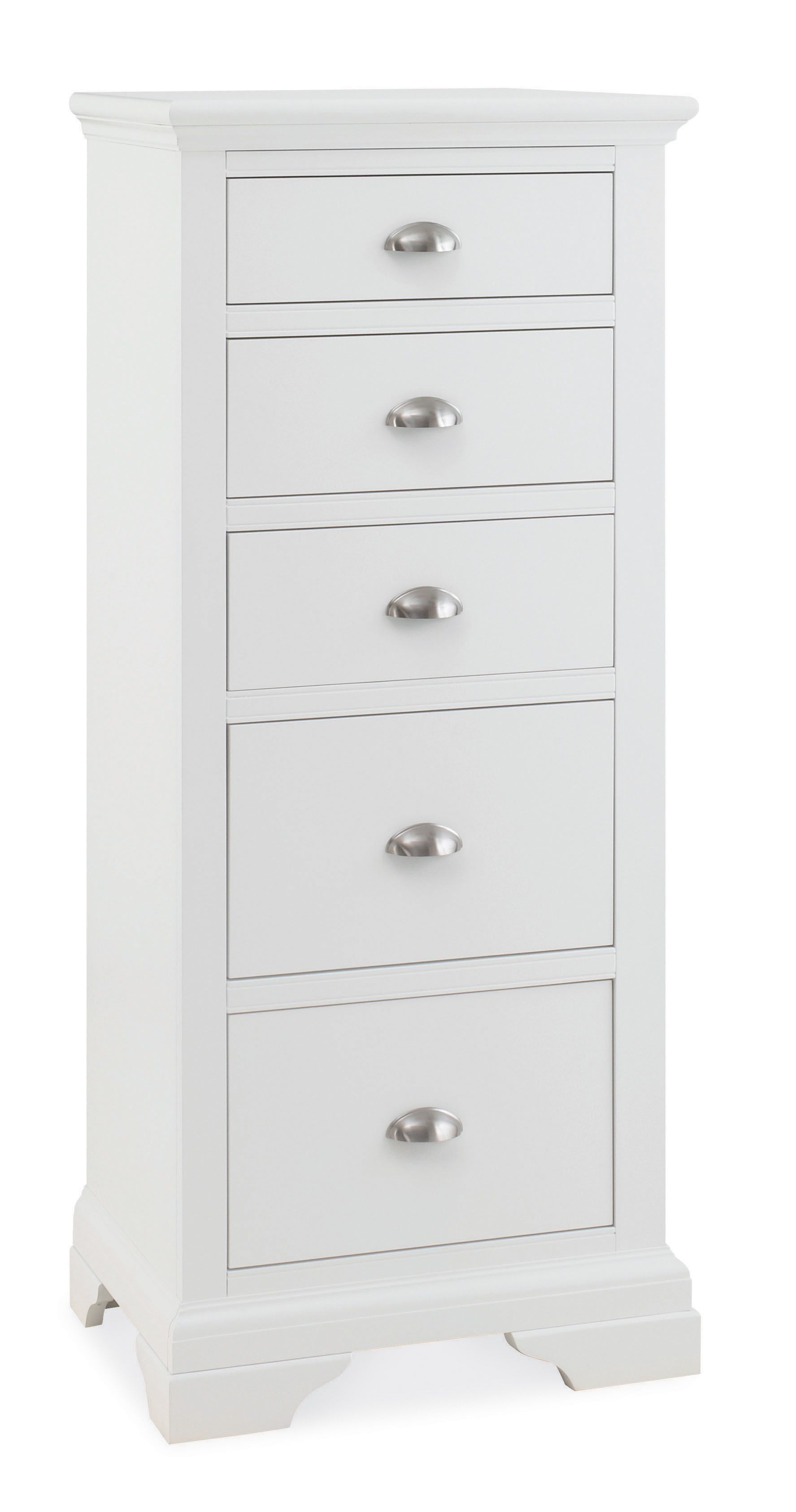 - The Hampstead White 5 Drawer Tall Chest features 5 soft-closing drawers for a stylish storage solution in a sleek design. The crisp white painted finish offers a fresh twist for the contemporary bedroom without compromising on traditional style.