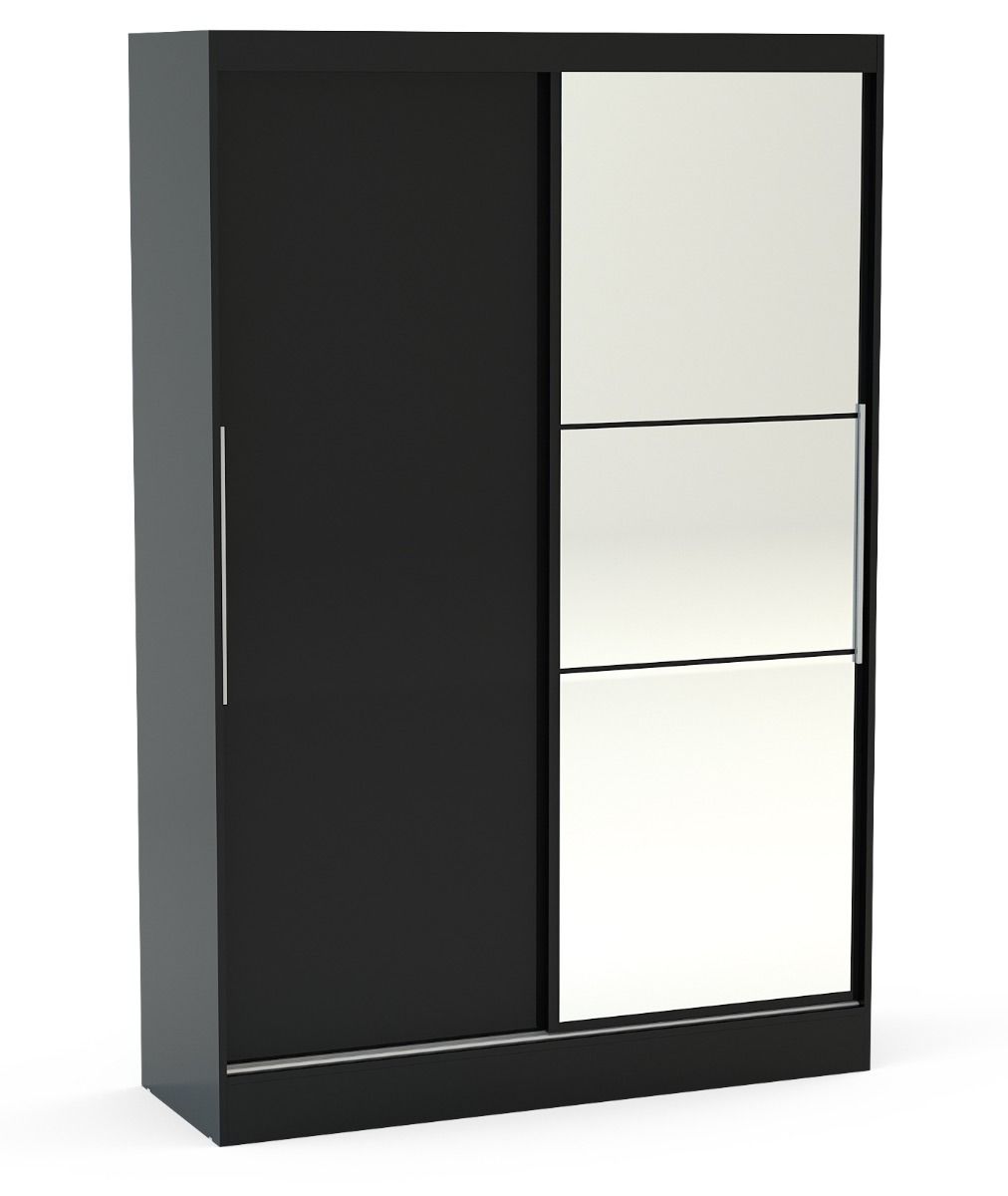Modern and sleek, the Lynx Black 2 Door Sliding Wardrobe with mirror combines a high-gloss finish with bold silver detailing to make any space feel contemporary. Constructed from MDP (multiple density particleboard), this high-quality wardrobe features a sliding mirrored door plus an internal top shelf for additional bedroom storage.