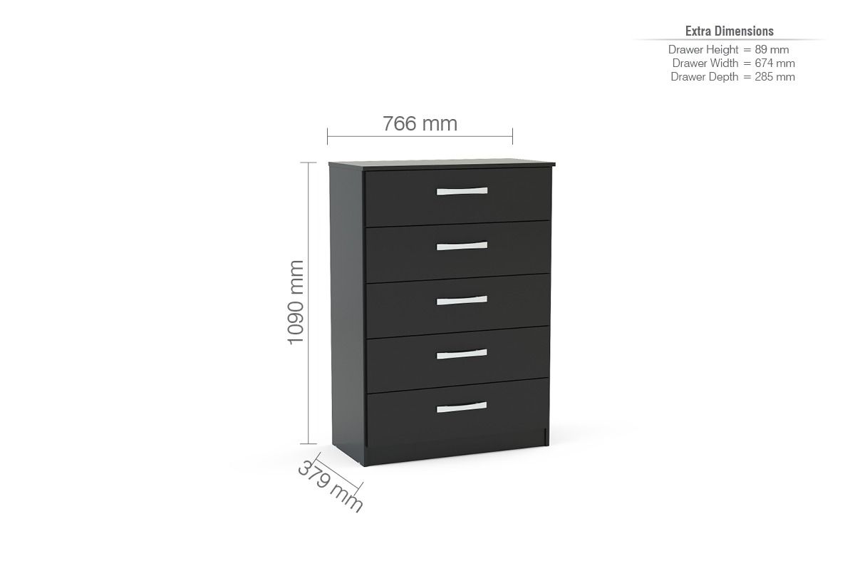 Modern and sleek, the Lynx Black 5 Drawer Chest combines a high-gloss finish with bold silver detailing to make any space feel contemporary. Constructed from MDP (multiple density particleboard), this high-quality bedside is available in a choice of four high-gloss lacquer colour options: white & grey, black, white, or black & white, or alternatively there are an additional colour option combining high-gloss lacquered panels with walnut paper foil: walnut & black. The top panel of this chest can support up to 8 kg of weight and each drawer can support up to 5 kg.