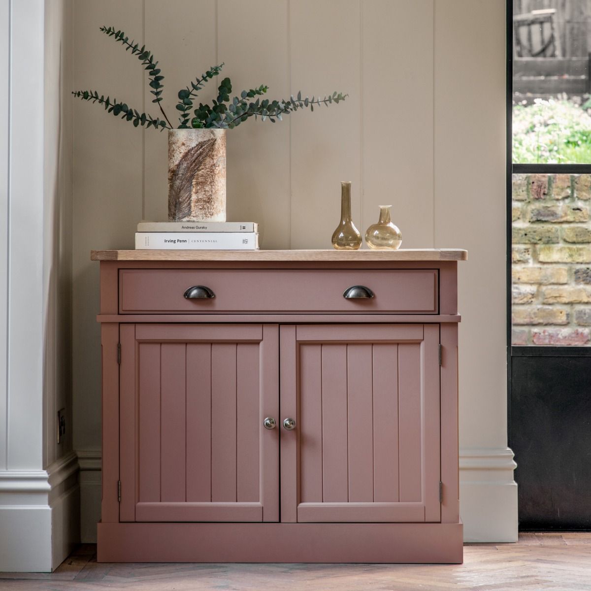 - Combining traditional farmhouse design with a modern style whilst also offering a practical storage solution with a top drawer and internal cupboard space with adjustable shelves. Featuring a combination of a grooved & planked oak top, hand painted textured base and traditional metal handles.