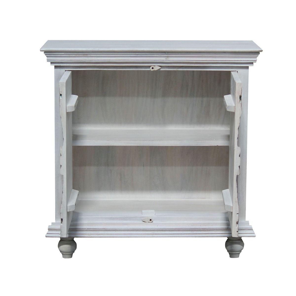 - With its breathtaking colourful carvings and whitewashed finish, this Meera sideboard exudes a unique charm that elevates any room. Two doors of the sideboard open to reveal one shelf, providing safe storage for your belongings. The whitewashed finish lends it a rustic elegance while the colourful carved doors take centre stage. Plus, sturdy legs ensure the durability of this masterpiece, making it as dependable as it is beautiful.