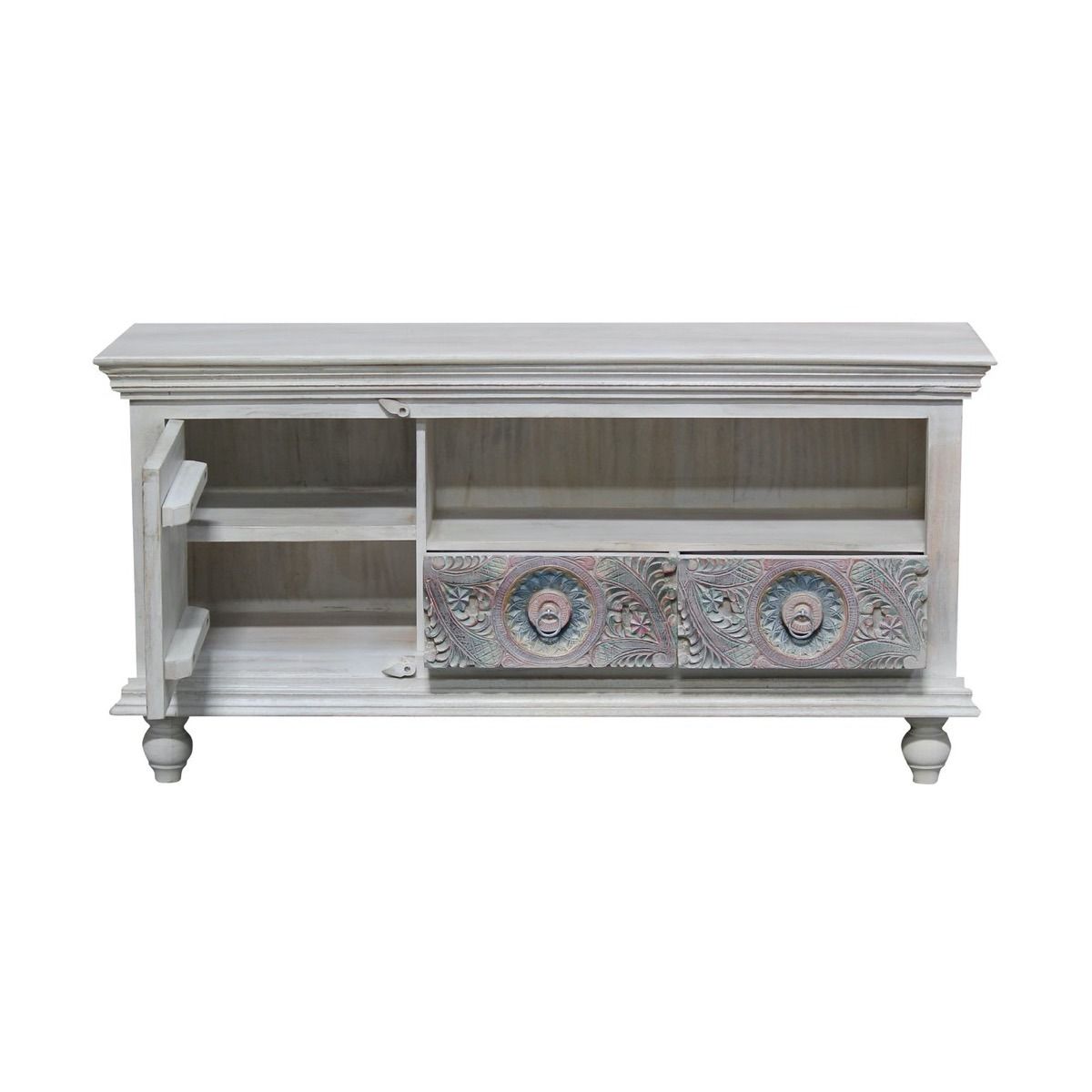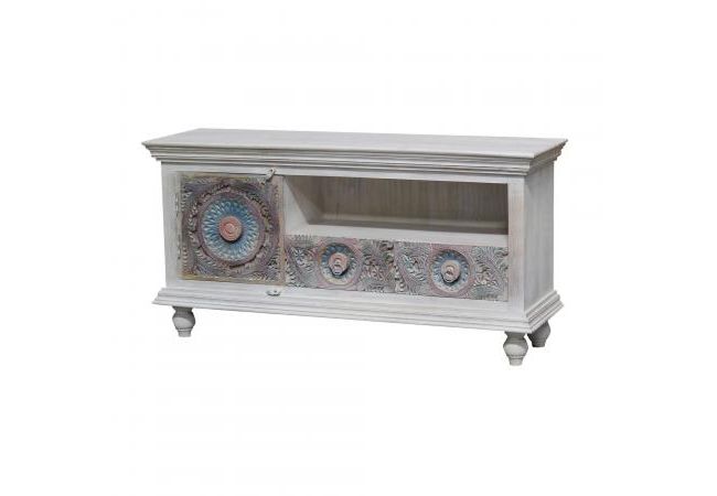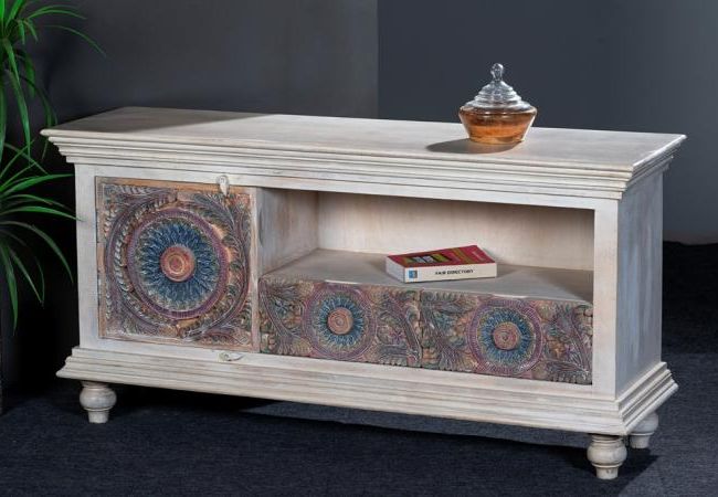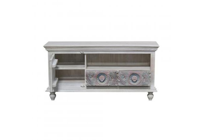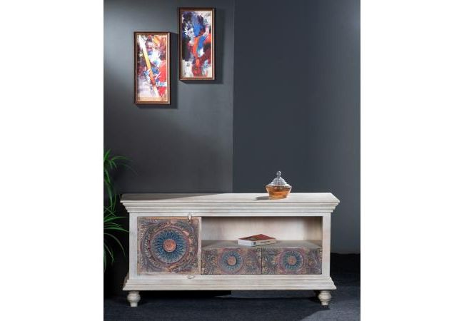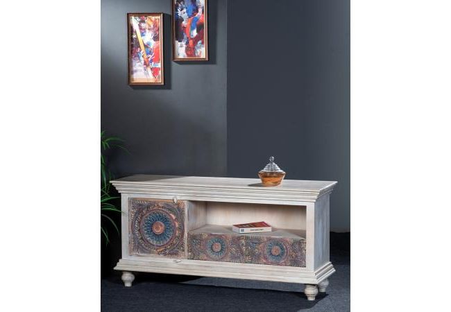 - The Meera TV unit can be a wonderful addition if you want to add antique charm to your decor. This wooden TV unit accentuated with a whitewash finish and colourful carved pattern will give your space an alluring, weathered look. The TV unit has two closed shelves and an open storage box for storing your remote, cables, and other accessories.