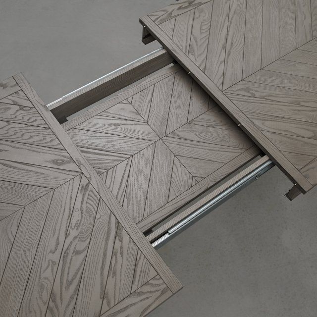 - Part of the Monroe range, this oval dining table combines beauty with practicality through its extendable, saw-cut ash wood top with chevron patterning and matching turned tapering legs. Finished in a crisp silver grey, this table reflects elements of both classic and contemporary design, successfully allowing it to blend seamlessly with a variety of interior aesthetics.