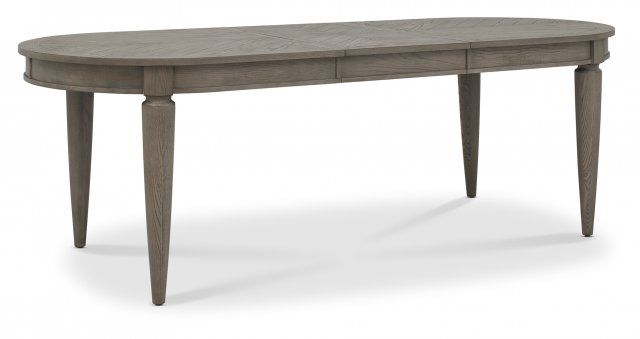 - Part of the Monroe range, this oval dining table combines beauty with practicality through its extendable, saw-cut ash wood top with chevron patterning and matching turned tapering legs. Finished in a crisp silver grey, this table reflects elements of both classic and contemporary design, successfully allowing it to blend seamlessly with a variety of interior aesthetics.