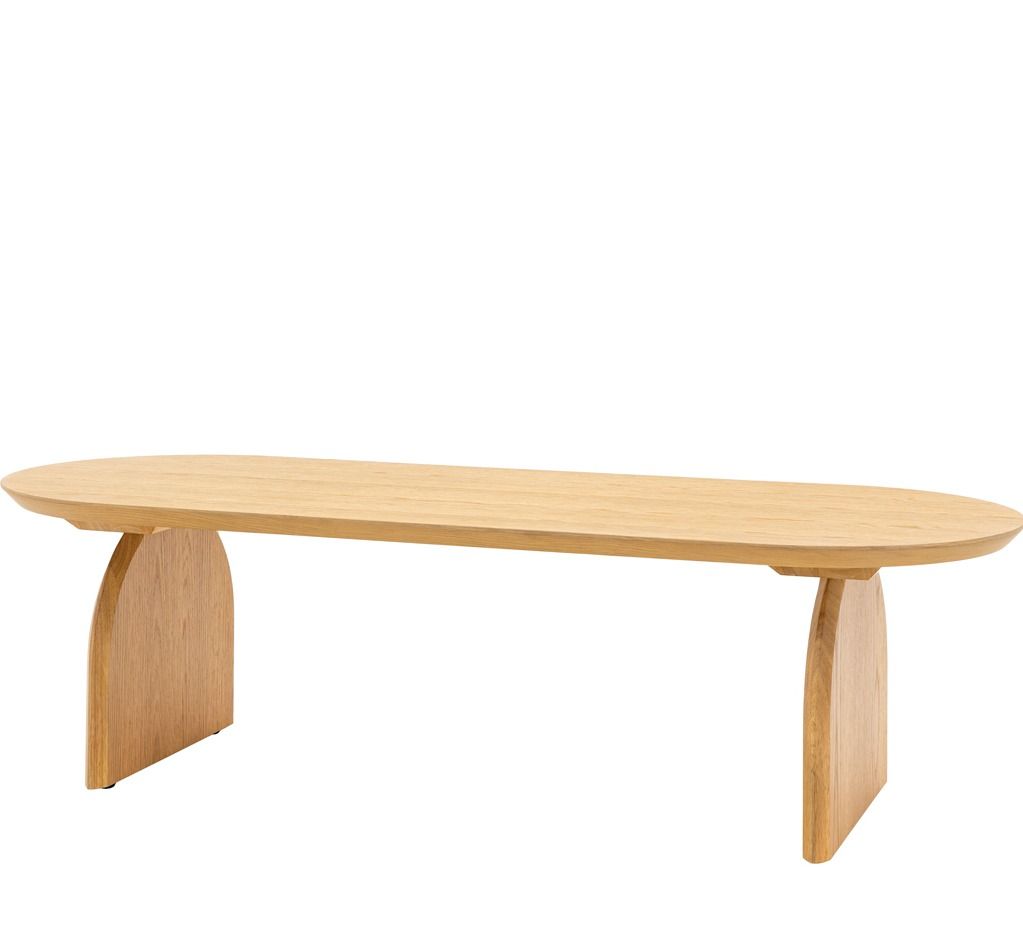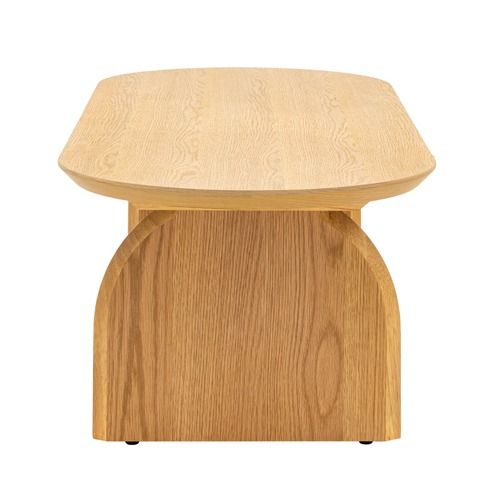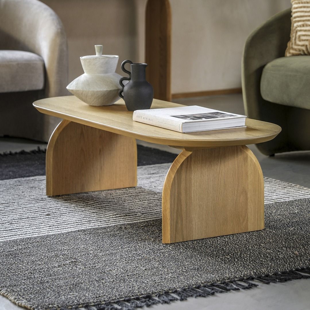 - With a nod towards retro style but in a more modern format, this stunning coffee table features a lovely elegant top with rounded ends, with this form echoed on the tops of the legs. It is made using oak veneers and solids, where practical, with a natural matt finish. Matching pieces available.