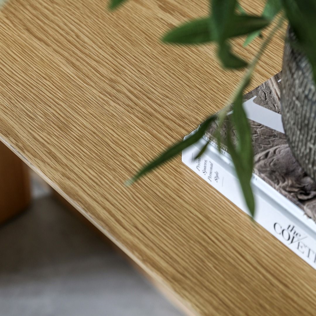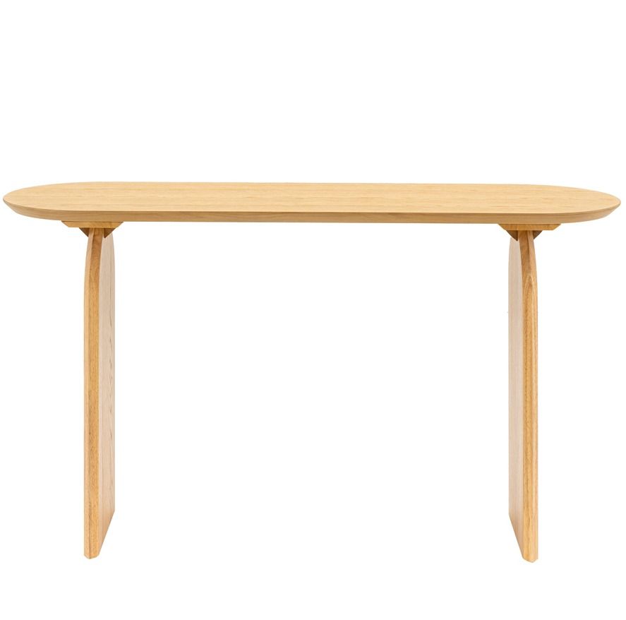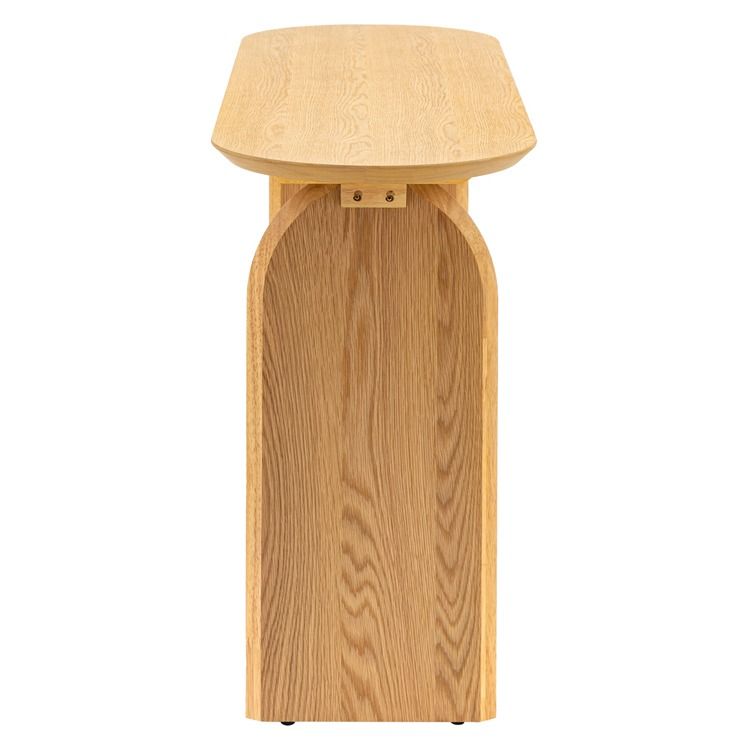 - With a nod towards retro style but in a more modern format, this stunning console table features a lovely elegant top with rounded ends, with this form echoed on the tops of the legs. It is made using oak veneers and solids, where practical, with a natural matt finish. Matching pieces available.