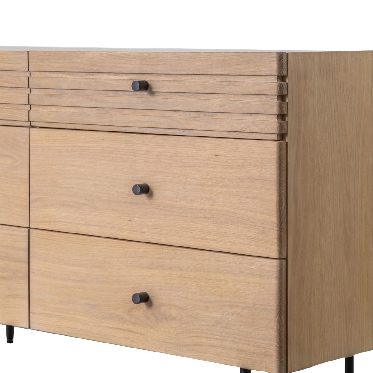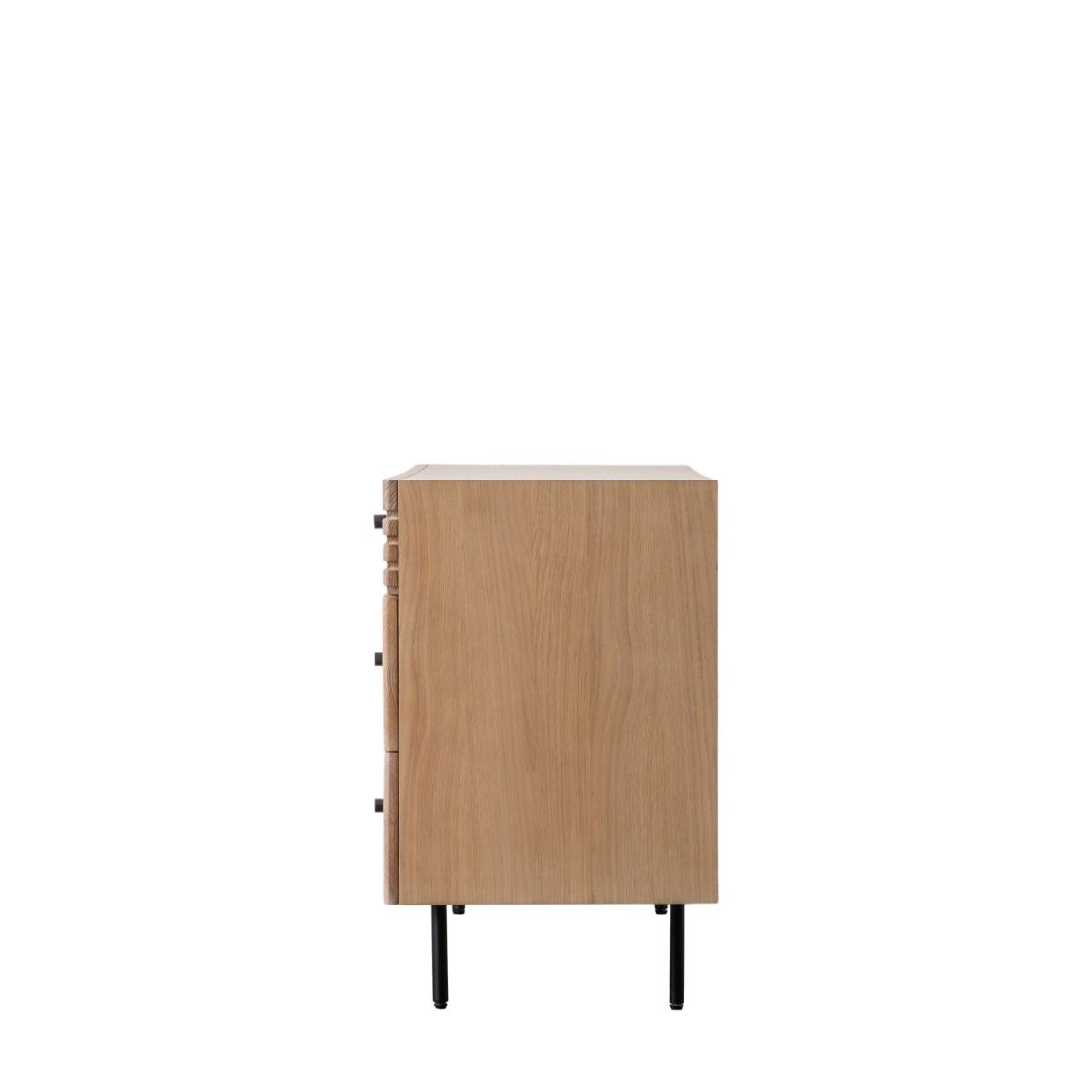 - A unique Japandi style, the Sakura Bedside Chest is crafted with solid oak detailed drawer fronts and a beautiful combination of traditional and contemporary design, making it a stunning addition for your modern home. Created to compliment the other pieces of the Sakura range, with detailing up the edges, this chest portrays a classy and high-quality design. The slim black metal legs and handles complete the look by perfectly contrasting with the oak finish to create a modern two toned design