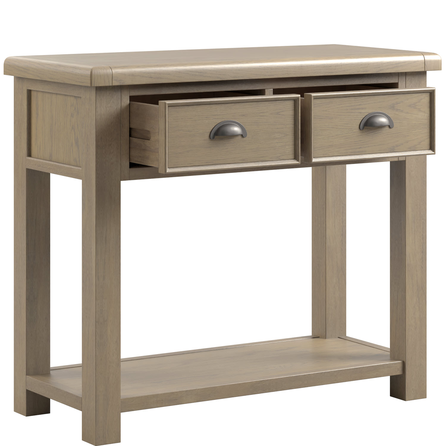 - The Sartona Oak Console Table is a refined and versatile piece designed to add both style and functionality to your living space. Crafted from oak with a soft, neutral finish, it showcases subtle grain details that bring warmth and character to the room. Featuring two compact drawers for everyday essentials and a lower shelf for additional storage or display, this console table is ideal for hallways, living rooms, or dining areas. Its clean lines and balanced proportions allow it to blend seamlessly into both modern and classic interiors.