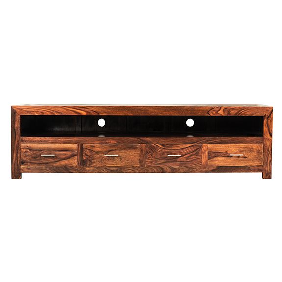 - The Vero Cube Long 4 Drawer TV Unit showcases the bold character of the Vero range, combining clean lines with rich natural grain patterns. Crafted from solid Indian rosewood, it offers a strong, contemporary presence that suits both modern and classic interiors. The long, low-profile design provides a perfect base for larger TVs while maintaining a balanced, uncluttered look. Spacious open shelving and drawers make it both practical and visually striking.