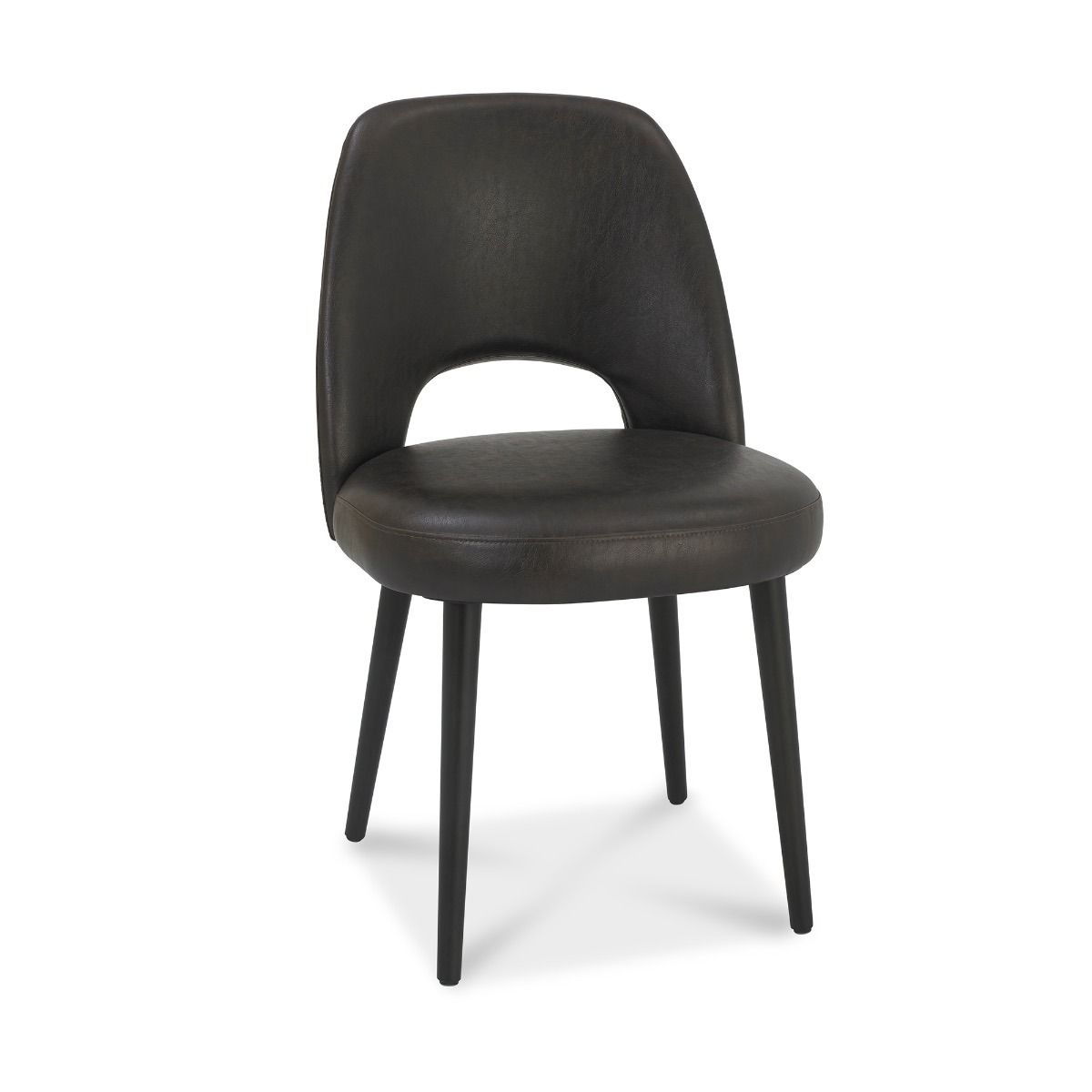 Inspired by mid-century industrial styling mixed with hints of retro and Scadinavian designs. This Vintage Weathered Oak Upholstered Chair in Old West Vintage Leather creates a sophisticated yet fashionable combination to your interior. The smooth definition of the peppercorn painted base and legs complement the natural shaping of the curved edged seating. With its finely tapered legs, aged bonded leather and linear structure, this Vintage and Modern accent contrasts through its layers of foam to add simplicit beauty to its comfort and functionality.