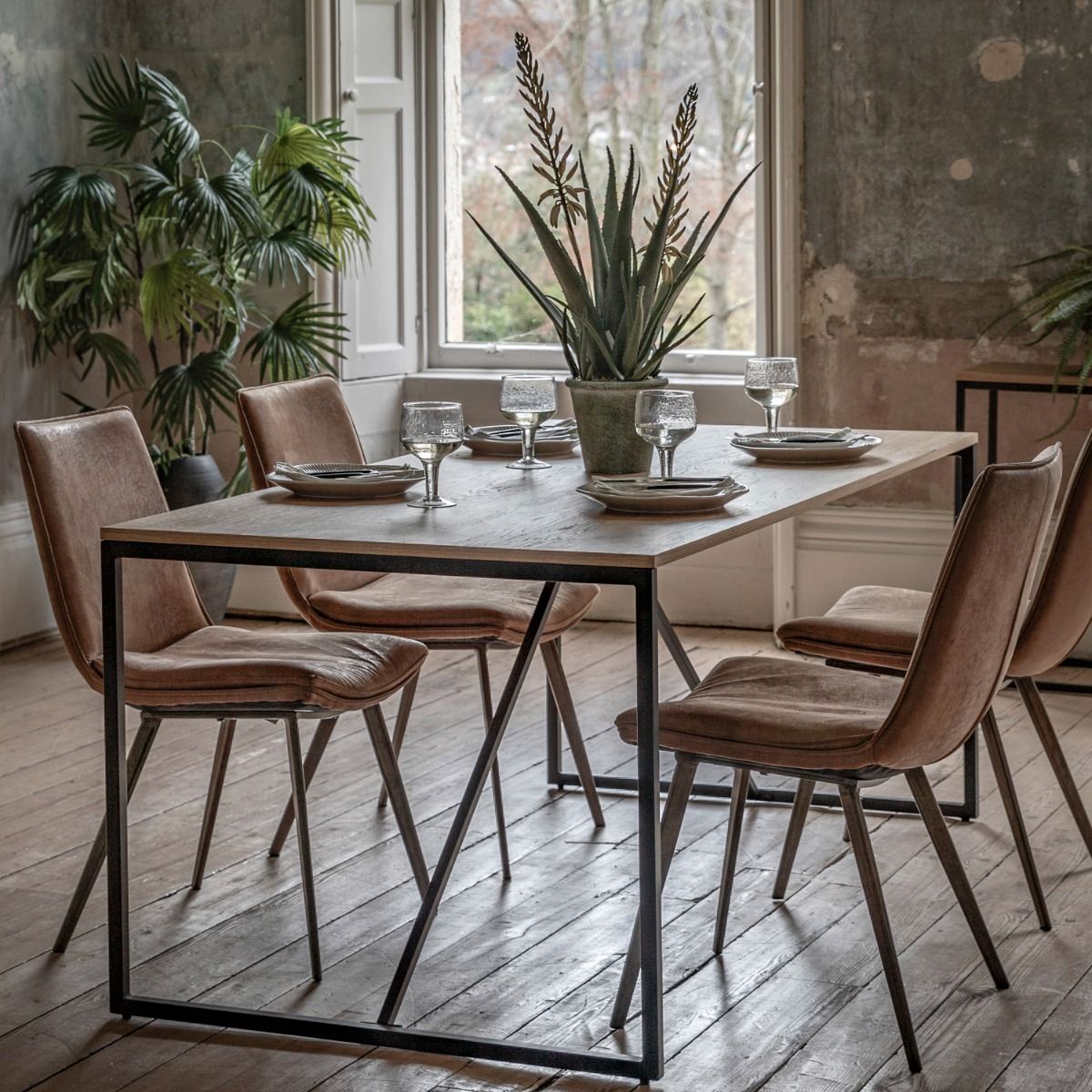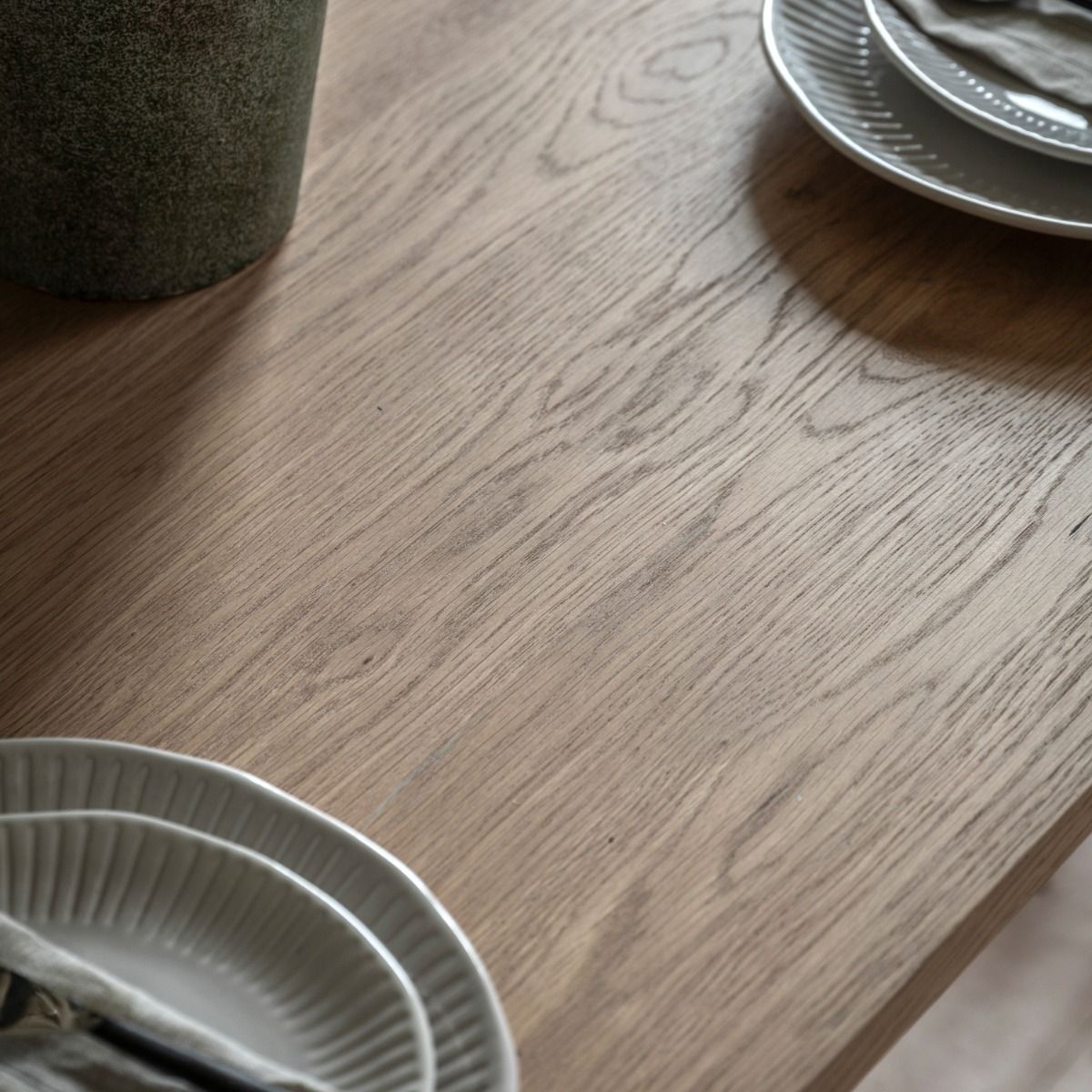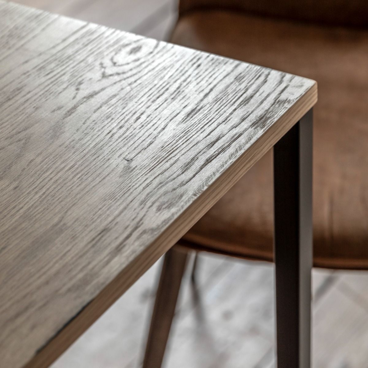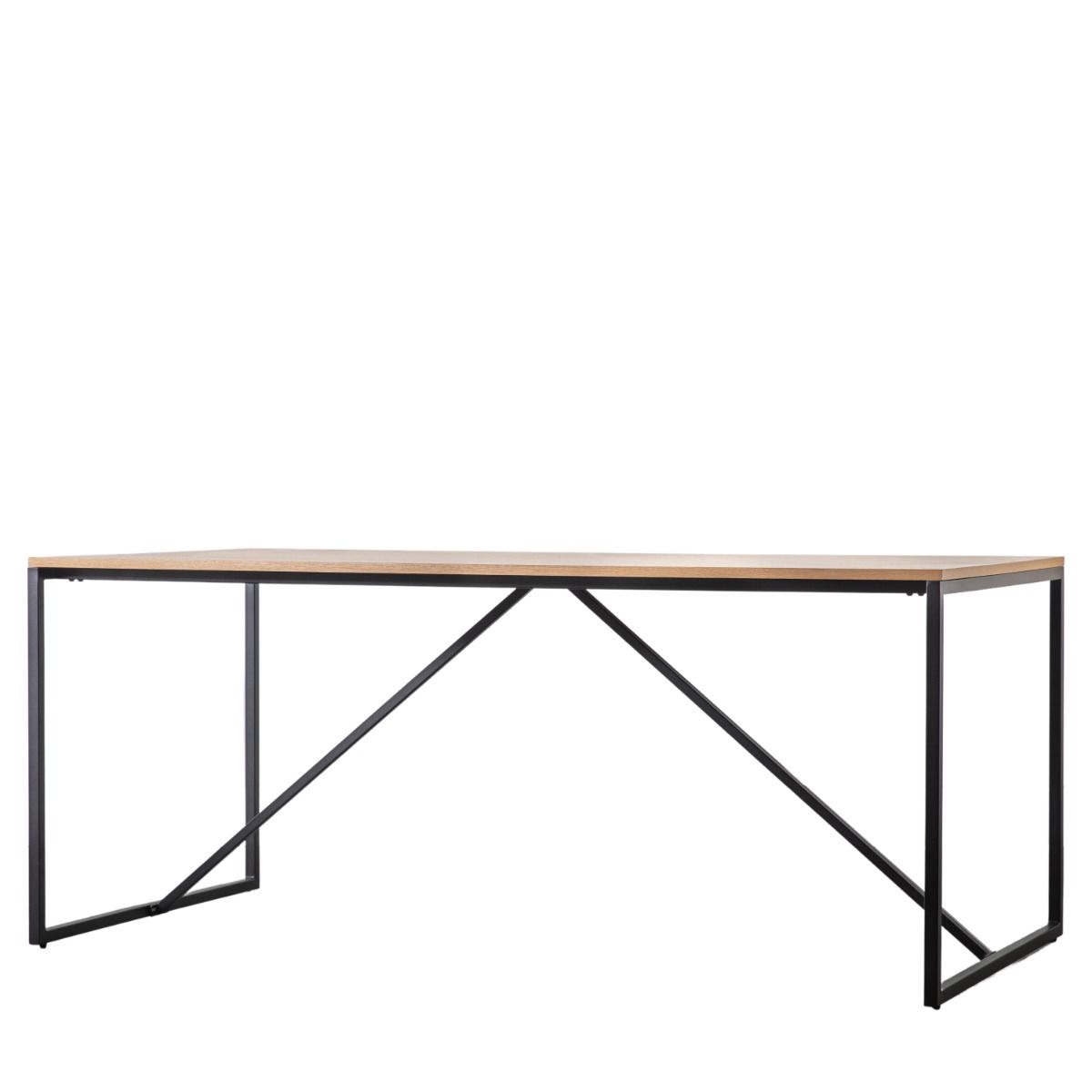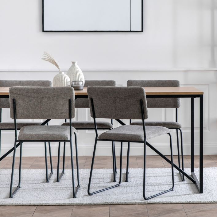 - Sleek and clean sharp lines with a natural oak veneer complimented by the black metal base displays a crisp modern style. The Warren dining table is the perfect addition to enhance your interior whilst being functional.