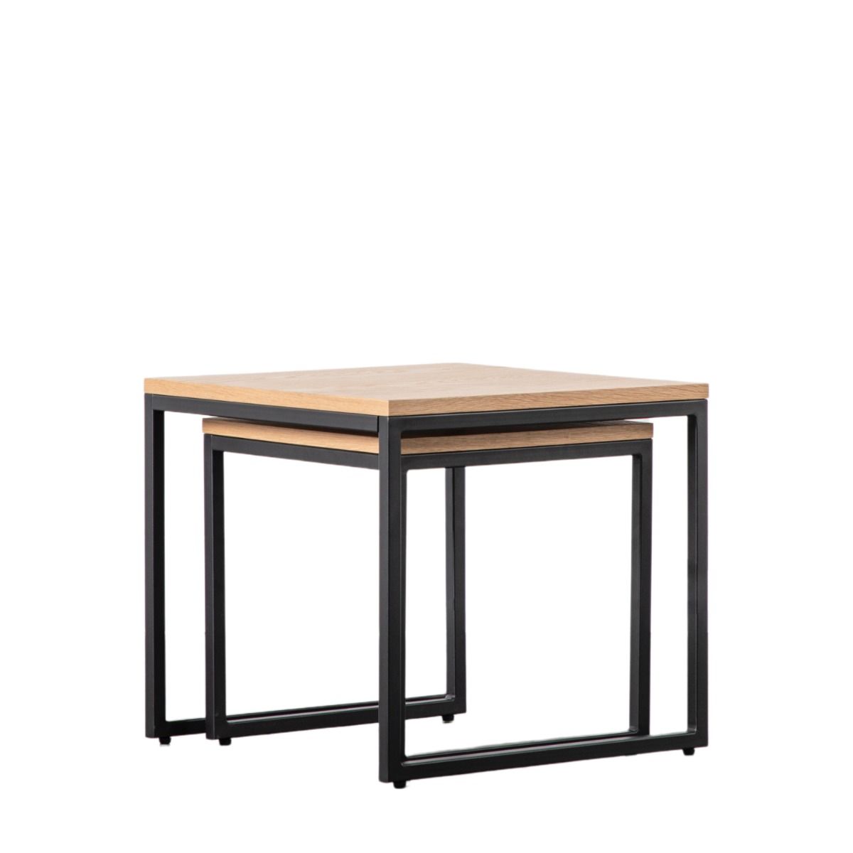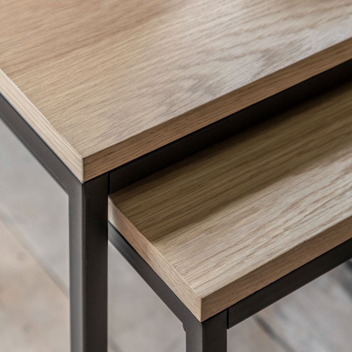 - Enhancing contemporary design, the Warren nest of 2 side tables is the perfect addition to your home. Combining sharp clean lines, natural oak veneers and complimented with a matt black metal base to create a crisp modern style.